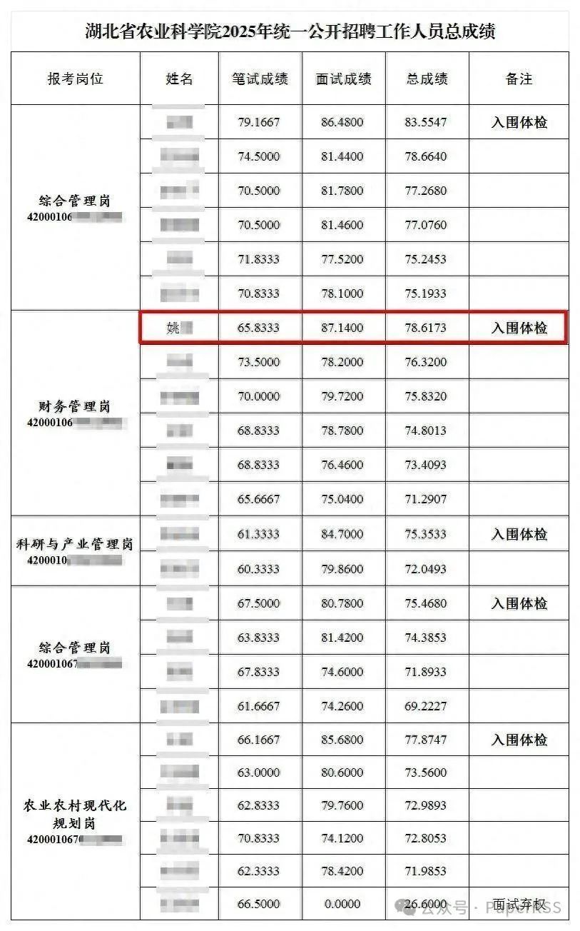 6月13日,该院发布的《2025年统一公开招聘工作人员总成绩》显示,报考财务管理岗的应聘者姚某笔试成绩 65.8333 分,在同岗位 6 人中排名倒数第二,却以面试 87.1400 分的全场最高分逆转,最终以 78.6173 分的总成绩拔得头筹,领先第二名 2.2973 分进入体检环节。