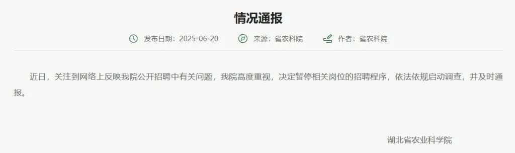 6月20日,湖北省农业科学院发布情况通报称,近日,关注到网络上反映学院公开招聘中有关问题,学院高度重视,决定暂停相关岗位的招聘程序,依法依规启动调查,并及时通报。